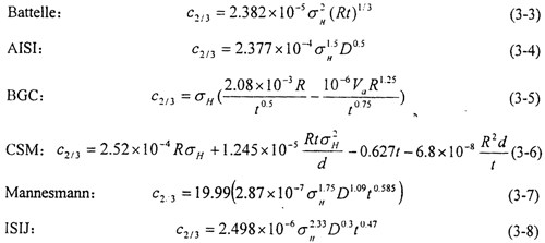 在雙曲線法的基礎(chǔ)上,結(jié)合大量的實(shí)驗(yàn)結(jié)果對(duì)止裂韌性進(jìn)行標(biāo)定,世界各大研究機(jī)構(gòu)分別給出了簡(jiǎn)便易算的經(jīng)驗(yàn)公式用以估算臨界止裂韌性,列舉如下: