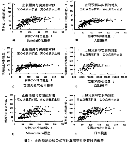 圖3-4表示了Battelle應(yīng)用Maxey雙曲線法對(duì)全尺寸實(shí)驗(yàn)數(shù)據(jù)庫(kù)所做的DDF止裂韌性預(yù)測(cè),圖3-4a至圖3-4f分別對(duì)應(yīng)于式(3-3)至式(3-8)。圖中顯示的實(shí)驗(yàn)用管的鋼級(jí)包括X52到Xl00,管徑范圍從4O6mm到1422mm,實(shí)驗(yàn)最高壓力超過16MPa?梢,預(yù)測(cè)模型在管材韌性低于某一水平時(shí)預(yù)測(cè)結(jié)果與實(shí)物實(shí)驗(yàn)結(jié)果基本吻合,但當(dāng)管材韌性較高時(shí)出現(xiàn)明顯偏差,預(yù)測(cè)應(yīng)該止裂的管線沒有止裂。經(jīng)典的止裂預(yù)測(cè)模型在預(yù)測(cè)夏比能量值高于94J的管材時(shí),已經(jīng)偏于危險(xiǎn),即過高估計(jì)了管材的止裂性能。