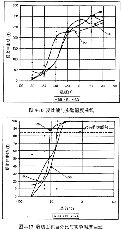 表4-3給出了歸納的夏比沖擊能量值及85%剪切面積對(duì)應(yīng)的轉(zhuǎn)變溫度。