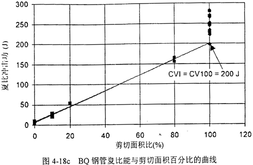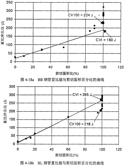 圖4-18a,b,c給出了三家鋼管的夏比能與剪切面積的關(guān)系,以及85%剪切面積對(duì)應(yīng)的轉(zhuǎn)變溫度。圖中CV100表示100%剪切面積時(shí)最低的夏比能,CVI表示最低夏比平臺(tái)能,也稱夏比轉(zhuǎn)變能,CVP表示夏比平臺(tái)能。菱形實(shí)驗(yàn)點(diǎn)表示剪切面積高于90%,方形實(shí)驗(yàn)點(diǎn)表示低于90%可以看到,剪切面積低于90%時(shí),夏比能與剪切面積呈線性關(guān)系。