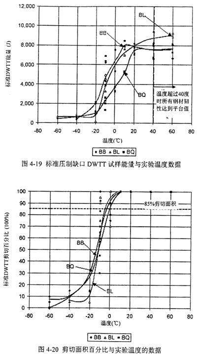 圖4-19顯示了標(biāo)準(zhǔn)壓制缺口DWTT試樣能量與實(shí)驗(yàn)溫度數(shù)據(jù)。