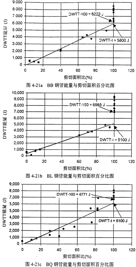 圖4-21a,b,c是能量與剪切面積百分比圖。和前面-樣,菱形實(shí)驗(yàn)點(diǎn)表示剪切面積高于90%,方形表示低于90%。與對(duì)CVN數(shù)據(jù)的處理類似,分別定義DWTT-100表示100%剪切面積時(shí)最低的DWTT能,DWTT-I表示DWTT轉(zhuǎn)變能,DWTT-P表示DWTT平臺(tái)能。由圖4-21可確定DWTT和DWTT-100的值。