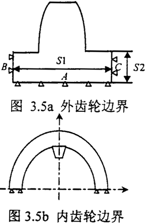 其內齒的邊界范圍如果齒圈的厚度很薄時為了記及齒圈的變形取半個齒輪,如圖3.5b所示: