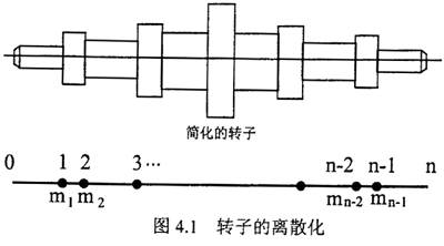一個實際轉子,可以看作由一根變截面的軸和分布其上的若干圓盤所組成。用集總質量法,可將其離散成n段無質量的彈性軸和n-1個集總質量。如圖4.1所示。具體過程見文獻。