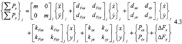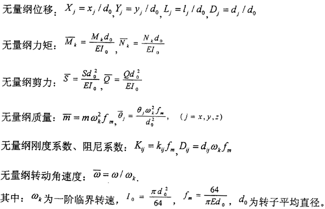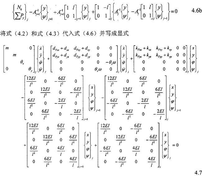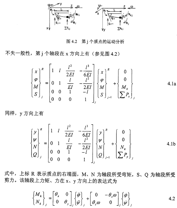 式4.3中右端第一項為慣性力:三、五兩項為滑動軸承的油膜力;二、四兩項為外加阻尼力及剛度力……,Pcx,Pcy則代表與系統(tǒng)本征值無關的外加激勵力、不平衡力、重力或其它控制力。ΔFx,ΔFy為齒輪動態(tài)嚙合力在x、y方向上的分量。當所簡化的質點是各向同性時,其直徑轉動慣量θx=θy=Jd,極轉動慣量θz=Jp。
