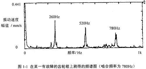 齒輪在傳動過程中,輪齒是不斷地處在一齒與兩齒交替咬合狀態(tài),對于斜齒輪,是不斷地處在兩齒與三齒交替咬合狀態(tài)。當(dāng)齒側(cè)有間隙時,此時的振動體系是時變的非線性系統(tǒng);輪齒間隙過大時還會出現(xiàn)瞬時脫齒狀態(tài)。因此,齒輪所產(chǎn)生的振動除了和輪齒嚙合剛度時變性有關(guān)外,還和齒輪的制造誤差(如質(zhì)量偏心、齒距偏差和齒形誤差)、裝配不良(如兩個齒輪軸心線不平行)、齒輪正常損傷(如齒輪正常磨損等)和齒輪非正常損傷(如齒面疲勞點蝕、齒面剝落、齒面燒傷、塑性變形和膠合撕傷等)有關(guān)。人們一般都認(rèn)為,齒輪在振動時其振動故障頻率為齒輪嚙合頻率的n倍(n=l,2,3,…),但實際情況并不完全如此,如在圖1-1中,齒輪振動故障頻率為齒輪嚙合頻率的1/3、2/3和3/3倍,振動速度的幅值也較齒輪正常時大一些;在另外一些場合,齒輪振動故障頻率為n/m倍(n,m皆為正整數(shù))。因此很有必要對產(chǎn)生分?jǐn)?shù)倍亞諧和超諧振動的原因作深入的研究工作。