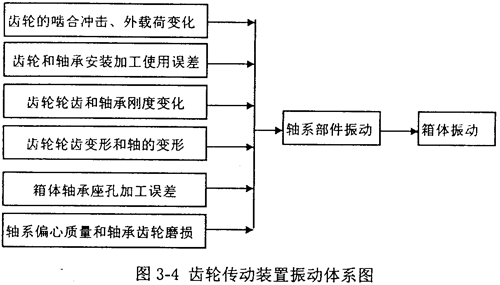 裝有齒輪、軸和軸承的軸系是齒輪傳動裝置的關(guān)鍵部件。在齒輪傳動裝置的工作過程中,箱體與其內(nèi)部的軸系部件構(gòu)成一個振動耦合體系,見圖3-4。軸系部件的振動通過軸承激發(fā)箱體振動,這樣在軸承外圈上安裝套圈并粘貼應(yīng)變片,拾取套圈上的應(yīng)變信號,也就是對齒輪傳動裝置箱體所受的動態(tài)激勵力信號進(jìn)行測試和分析,就可對齒輪傳動裝置內(nèi)的軸系部件進(jìn)行故障診斷。這種振動測試故障診斷的方法優(yōu)點是能直接拾取齒輪傳動裝置內(nèi)的軸系部件的振動故障信號,頻響范圍寬,費用低。缺點是需專門制做套圈。