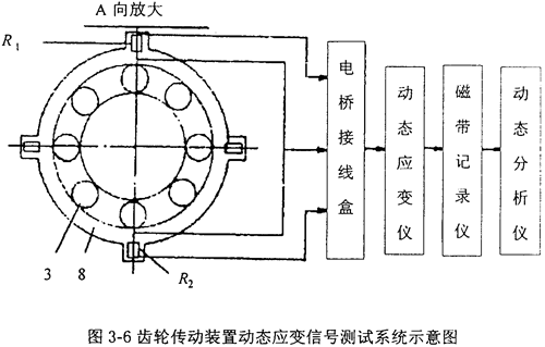圖3-5是被測試的齒輪傳動裝置傳動系統(tǒng)簡圖,圖3-6是測試該齒輪傳動裝置箱體動態(tài)激勵力應(yīng)變信號的系統(tǒng)示意圖。零件8為裝在軸承外圈上的套圈。套圈把軸系施加給軸承的載荷分成水平方向和垂直方向再傳給箱體。如圖3-6所示,在套圈的水平和垂直方向分別貼上兩片電阻應(yīng)變片,并分別組成各自的全電橋電路。當(dāng)軸系產(chǎn)生振動時,軸承對箱體的作用力也隨之發(fā)生變化,也使貼在套圈上的應(yīng)變片的電阻值產(chǎn)生變化,而電阻的變化則通過動態(tài)電阻應(yīng)變儀輸出電壓信號,并經(jīng)磁帶記錄儀將此電壓信號記錄下來。若將所得的信號在動態(tài)數(shù)字分析儀上進(jìn)行時域和頻域分析,再經(jīng)過比較,就可對齒輪傳動裝置內(nèi)的軸系部件的故障作出較為正確的診斷。