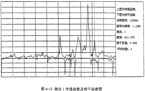 圖4-13是測(cè)點(diǎn)1垂直方向的傳遞函數(shù)及相干函數(shù)圖,其它點(diǎn)的傳遞函數(shù)圖由于篇幅關(guān)系省略。