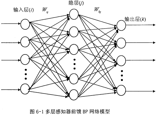 BP算法即是誤差反傳訓練算法,它是一種有導師的訓練算法,它在給定輸出目標的情況下,按其實際輸出與目標值之差的平方和為目標函數(shù),通過調(diào)節(jié)權值使目標函數(shù)達到最小值。多層感知器前饋BP網(wǎng)絡模型如圖6-1所示。