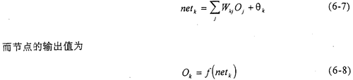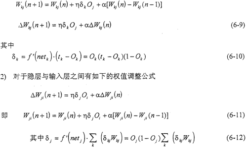 對于圖6-1所示的網(wǎng)絡,其訓練學習的過程包括:1)網(wǎng)絡內(nèi)部的前向計算;2)誤差的反向傳播。其主要目的就是通過逐步調(diào)整網(wǎng)絡的內(nèi)部連接權值,使網(wǎng)絡的均方誤差達到我們的要求。網(wǎng)絡內(nèi)部的連接權值的調(diào)整,都是采用推廣的δ規(guī)則來完成的。