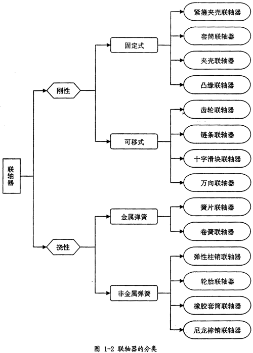 就聯(lián)軸器種類(lèi)而言,若按補(bǔ)償兩軸相對(duì)位移能力的不同可分為:剛性聯(lián)軸器和撓性聯(lián)軸器;剛性聯(lián)軸器按能否允許兩軸有相對(duì)位移又可分為:固定式聯(lián)軸器和可移式聯(lián)軸器;撓性聯(lián)軸器按其彈性元件的不同可分為金屬?gòu)椈陕?lián)軸器和非金屬?gòu)椈陕?lián)軸器;若按結(jié)構(gòu)可分為套筒聯(lián)軸器、鏈條聯(lián)軸器、輪胎聯(lián)軸器等等。其總的分類(lèi)圖如圖1-2所示。