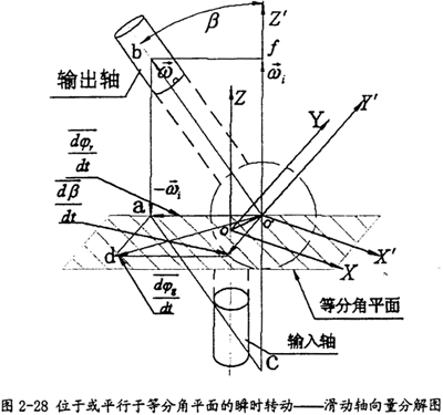 如圖2-28所示,輸入軸與輸出軸通過一個萬向聯(lián)軸器J聯(lián)接,兩軸夾角β為變量,輸出軸相對于輸入軸存在瞬時轉(zhuǎn)動——滑動軸,用矢量