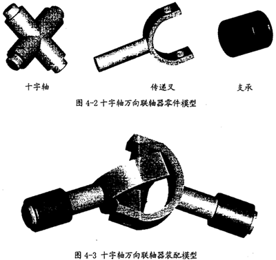 當前,在工程領域,應用美國PTC公司的CAD軟件Pro/E和美國MDI公司的動力學仿真軟件ADAMS聯(lián)合進行復雜機械系統(tǒng)的動力學仿真研究是一種較實用、較流行的仿真方案。本文的仿真分析中所有模型均是采用這種方案?紤]到建模的注意因素,在用Pro/E建模的過程中,省去了十字軸萬向聯(lián)軸器的許多細小結構,如潤滑部分、滾針軸承、彈簧卡圈等,只是保留了十字軸萬向聯(lián)軸器在原理上進行傳動的必需構件和運動副。在此原則下建立的十字軸萬向聯(lián)軸器的各構件模型如圖4-2所示,實際上只包含十字軸和傳遞叉兩個活動構件。建立的十字軸萬向聯(lián)軸器的裝配模型如圖4-3所示。
