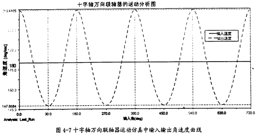 由圖4-6可知,仿真中十字軸萬向聯(lián)軸器的兩軸夾角實際上即是34.88°(原夾角的補角),在第二章的十字軸萬向聯(lián)軸器理論計算曲線圖中也包含了這個夾角下的運動分析曲線(圖2-12),比較圖2-12中β=34.88°的曲線和圖4-7的曲線,可知兩條曲線在變化頻率、形狀、值的大小都是一樣的。