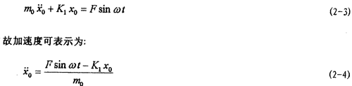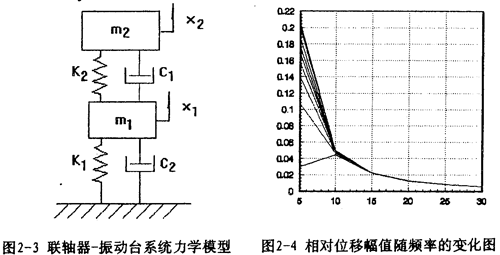 對(duì)應(yīng)的力學(xué)模型如圖2-3(見22頁(yè))所示,式中m1為振動(dòng)臺(tái)動(dòng)圈、聯(lián)軸器外套及固定在振動(dòng)臺(tái)上夾具的質(zhì)量;m2為聯(lián)軸器內(nèi)套、芯軸及配重的質(zhì)量;K1為振動(dòng)臺(tái)支撐動(dòng)圈部分的剛度系數(shù),K2為聯(lián)軸器彈性元件的剛度系數(shù);C1為振動(dòng)臺(tái)動(dòng)圈阻尼系數(shù);C2為聯(lián)軸器
