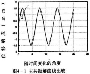 曲線圖如圖4-1所示。從圖中可以看到解析解曲線1和數字仿真解曲線2重合性較好,在振幅與相位上誤差都較小。