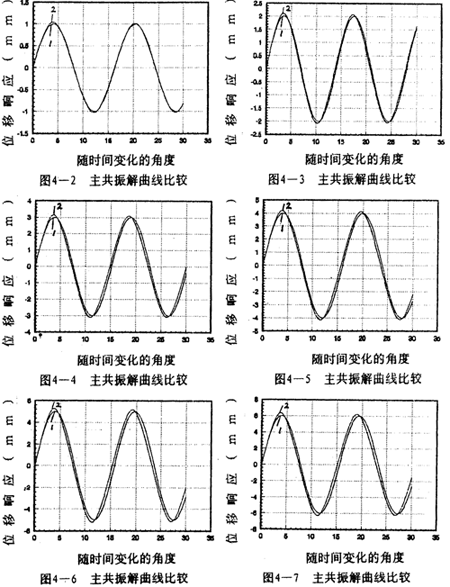 =2時兩者的重合性很好。(2).隨著振幅的增大,解析解曲線1和仿真解曲線2在相位上產生微小變化,解析解的相位超前仿真一個小量,原因是隨著振幅的增大,系統(tǒng)呈現更為強烈的非線性,而在推導中略去了高次項,但還是可以滿足工程的要求。(3)從(4-78)-(4-85)式中的各δ值可知,在聯(lián)軸器產生主共振的情況下,激振力很小。