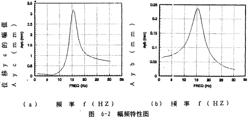 從圖6-2(b)可以知道,聯(lián)軸器從動(dòng)端質(zhì)量塊mb的位移幅值A(chǔ)yb從1赫茲開始隨頻率增大而迅速增大直至軸系的一階固有頻率15.2赫茲,然后隨頻率增大而迅速減小,在一階固有頻率處達(dá)到最大值。