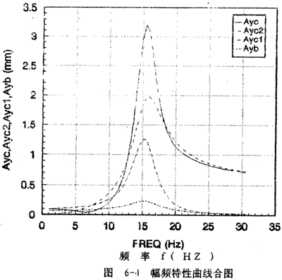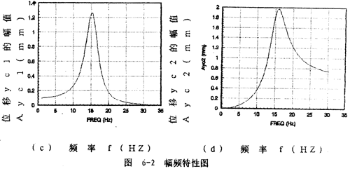 yc2的幅頻特性如圖6-2(d)所示。Ayc2從1赫茲開始隨頻率的增大而迅速增大,在軸系的二階固有頻率15.56赫茲處達(dá)到最大值,然后隨頻率增大而減小并趨于某一定值,Ayc2隨頻率變化的規(guī)律反映圓盤僅在質(zhì)量偏心激勵(lì)下,而軸系沒有鋼絲繩聯(lián)軸器影響時(shí)圓盤的幅頻特性?紤]上聯(lián)軸器對(duì)圓盤幅頻特性的影響部分Ayc1(圖6-2(c)所示部分),則圓盤的幅頻特性即為圖6-2(a)所示。由此可見,鋼絲繩聯(lián)軸器在頻率的較低段(0~11赫茲)對(duì)圓盤振動(dòng)有抑制作用。值得一提的是Ayc不是Ayc1和Ayc2的簡單相加,而與各頻率對(duì)應(yīng)的向量{a}中17個(gè)元素以及相位有關(guān)。