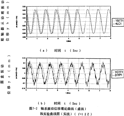 測(cè)量數(shù)據(jù)進(jìn)行分析處理后,結(jié)果如圖7-2~圖7-5所示。圖7-2(a)~(b)和圖7-3(a)~(b)分別給出調(diào)速頻率為1。2赫茲時(shí)圓盤和聯(lián)軸器從動(dòng)端y方向的振動(dòng)位移時(shí)域曲線,圖7-4、圖7-5分別給出聯(lián)軸器從動(dòng)端、圓盤y方向的振動(dòng)位移的理論和實(shí)驗(yàn)幅頻曲線圖(實(shí)線為理論曲線,圓點(diǎn)線為實(shí)驗(yàn)曲線),總的來看,理論與實(shí)驗(yàn)結(jié)果較好地重合。然而,在某些頻率點(diǎn)處,振動(dòng)位移幅值的理論計(jì)算與實(shí)驗(yàn)結(jié)果相差值,雖然絕對(duì)值差異并不大,但從相對(duì)值來講,差異較大,這是由于軸系還受到諸多因素,如軸承座、軸承、電動(dòng)機(jī)等振動(dòng)的相互影響;當(dāng)然,測(cè)試儀器,數(shù)據(jù)處理都有可能產(chǎn)生誤差。由圖7-2、7-3還可以看到,理論計(jì)算與實(shí)驗(yàn)所得的振動(dòng)位移時(shí)域曲線之間存在著相位差,這是因?yàn)椴杉瘮?shù)據(jù)時(shí),時(shí)域曲線的相位不能保證與理論計(jì)算相位一致造成的,但這不影響兩者的本質(zhì)特性