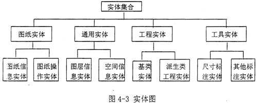 在面向?qū)ο蟮腃AD集成開發(fā)系統(tǒng)里,系統(tǒng)數(shù)據(jù)模型的基本元素就是ARX開發(fā)語言中的(多是C/C++語言)類,類實(shí)例化后稱為對象或?qū)嶓w,整個圖紙就是一個實(shí)體集合,主要由四大塊組成:圖紙實(shí)體集合、通用實(shí)體集合、工程實(shí)體集合和工程實(shí)體集合。其中,圖紙實(shí)體、通用實(shí)體和工具實(shí)體都為獨(dú)立類,沒有父類或子類;而工程實(shí)體集合中的各工程實(shí)體是由具有基本特征的基類實(shí)體派生而來,具有一個基類和若干個派生類,并且各實(shí)體集之間互相獨(dú)立(如圖4-3所示)