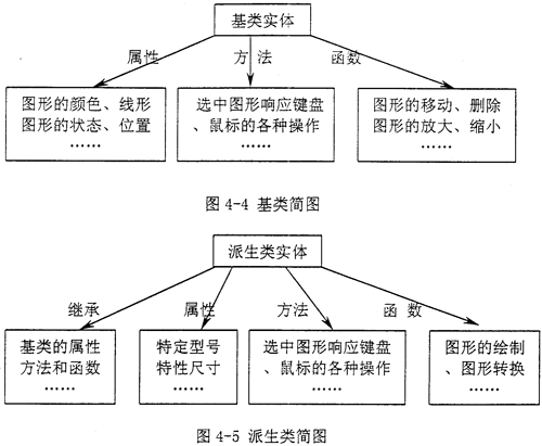 對于以上的問題,第一,要對行業(yè)的需求十分清晰,能夠?qū)π袠I(yè)中涉及到的工程實(shí)體進(jìn)行歸納,要具有“面向?qū)ο蟆钡木幊趟季S;第二,基類涉及的屬性方法和函數(shù)基本上與實(shí)體圖形的操作有密切關(guān)系(如圖4-4所示);派生類主要涉及到工程實(shí)體的特征屬性、特征方法和特征函數(shù)(如圖4-5示),完整地定義其基類和派生類是“面向?qū)ο蟮腃AD集成開發(fā)系統(tǒng)”中的核心部分;第三,要充分的利用AutoCAD已提供的資源,主要就是要利用AutoCAD系統(tǒng)中的*,dwg文件的圖形文件數(shù)據(jù)庫中的資源,熟悉各種AutoCAD中實(shí)體(例如點(diǎn)、直線、圓弧等)的DXF碼規(guī)則,并從中提取相關(guān)特征信息;第四,由于在AutoCAD中的.dwg文件中,存儲的是一些簡單的幾何的點(diǎn)、直線、圓、弧等信息,故還需要另一個文件去記錄整個圖紙的工程實(shí)體圖形的邏輯關(guān)系(下一節(jié)詳細(xì)介紹),隨同*.dwg文件的打開而打開,標(biāo)識*.dwg文件圖形中的實(shí)體圖形邏輯關(guān)系,隨同*.dwg文件的關(guān)閉而記錄*.dwg文件中的實(shí)體圖形邏輯關(guān)系。