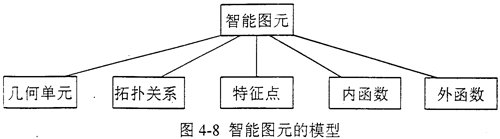 在系統(tǒng)實(shí)現(xiàn)中,智能圖元是一個典型的“類”的結(jié)構(gòu),包括幾何單元集合、拓?fù)潢P(guān)系描述、特征點(diǎn)集合、內(nèi)函數(shù)和外函數(shù)(見圖4-9),定義如下:
