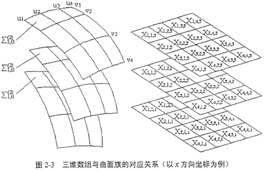 若已知曲面Σ1由一系列離散的坐標(biāo)值表示,則規(guī)則化后的坐標(biāo)值系列可以寫成二維數(shù)組成的形式,二維數(shù)組中的各維分別對(duì)應(yīng)u,v參變量或方向,二維數(shù)組中的各元素分別對(duì)應(yīng)曲面上節(jié)點(diǎn)的坐標(biāo);那么,曲面Σ1在坐標(biāo)S2中運(yùn)動(dòng)形成的曲面族{Σ1}可以用三維數(shù)組表示,三維數(shù)組的各維分別對(duì)應(yīng)u,v,t參變量或方向,并且曲面族中的各點(diǎn)與此三維數(shù)組的各個(gè)元素在空間結(jié)構(gòu)上是——對(duì)應(yīng)的,如圖2-3所示。