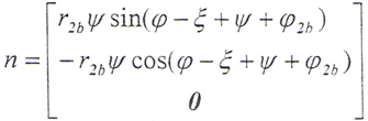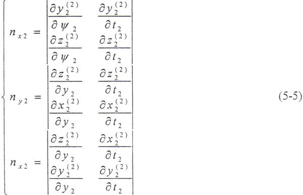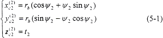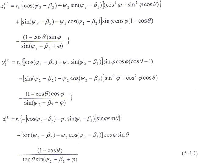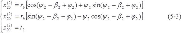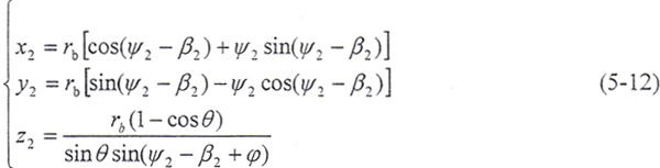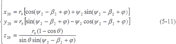令φ1=φ2=φ,將(5-2)式及由(5-8)式解出的t2代入(5-9)式,即可得到以ψ2、φ為參變量的外齒輪齒面方程: