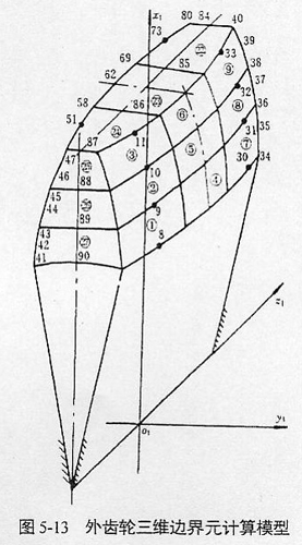 對(duì)共軛鼓形齒輪用邊界元法進(jìn)行接觸問題的研究與分析時(shí),首先只需對(duì)邊界即齒廓表面進(jìn)行單元?jiǎng)澐,然后?duì)每個(gè)嚙合點(diǎn)即接觸區(qū)進(jìn)行局部細(xì)分,不需像有限元法那樣,需從表到里將整個(gè)齒輪輪齒進(jìn)行劃分。