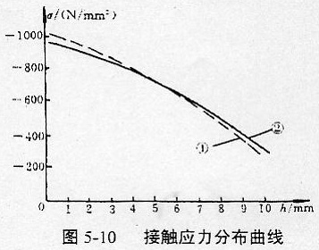 基于上述接觸問題的有限元與邊界元計(jì)算模型和前面的載荷分析,對(duì)一模數(shù)m=5mm、齒數(shù)Z=40、分度圓壓力角a=20°、分度圓直徑d=200mm、齒寬b=20mm、齒輪材料的彈性常數(shù)E=2.1×105N/mm2、泊松比μ=0.3、傳遞扭矩Mn=300N·m的共軛鼓形齒聯(lián)軸器鼓形齒輪Ⅰ進(jìn)行了接觸應(yīng)力計(jì)算,其簡圖如圖5-9所示。該問題接觸應(yīng)力的有限元與邊界元數(shù)值解和接觸應(yīng)力分布曲線分別如表5-1、圖5-10所示。曲線①(虛線)為接觸應(yīng)力的有限元解;曲線②(實(shí)線)為接觸應(yīng)力的邊界元解。