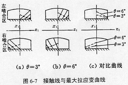 以一實(shí)際鼓形齒聯(lián)軸器為研究對(duì)象,其齒數(shù)均為Z=40,模數(shù)m=3mm,內(nèi)齒輪齒寬b=30mm,鼓形外齒輪寬b=20mm,E=2.1×105N/mm2,μ=0.3,工作軸間傾角分別為θ=3°和θ=6°兩種情況。由文獻(xiàn)[120]可知,其瞬時(shí)接觸線在一嚙合區(qū)內(nèi),內(nèi)齒輪齒面上的瞬時(shí)接觸線是自下向左上斜的曲線,外齒輪齒面上的瞬時(shí)接觸線是自下向右上斜的曲線;在另一嚙合區(qū)恰好相反,據(jù)此可確定瞬時(shí)載荷的作用位置,并假定載荷沿接觸線均勻分布,且傳遞最大扭矩。根據(jù)以上參數(shù)和文獻(xiàn)[121]的計(jì)算模型,應(yīng)用三維彈性邊界元計(jì)算程序計(jì)算了在鼓形齒聯(lián)軸器轉(zhuǎn)過一個(gè)齒距角的過程中,鼓形外齒輪某一輪齒的三個(gè)特定嚙合狀態(tài)下的形變分量,即開始進(jìn)入嚙合、嚙合中間和即將脫離嚙合三種狀態(tài)。計(jì)算發(fā)現(xiàn)在每種嚙合狀態(tài)下的相應(yīng)接觸線上中點(diǎn)附近沿齒高方向(x方向)的形變分量為最大。將各嚙合狀態(tài)下沿齒高方向取最大形變分量的點(diǎn)用光滑曲線連起來,即為該齒輪在傳動(dòng)嚙合過程中引起齒面產(chǎn)生裂紋痕跡主要誘因最大拉應(yīng)變?chǔ)?sub>x的分布規(guī)律或走向。其鼓形外齒輪某輪齒在傳動(dòng)嚙合過程中的接觸線及相應(yīng)的最大拉應(yīng)變?chǔ)?sub>x的分布曲線如圖6-7所示。圖6-7(a)與圖6-7(b)分別為軸間工作傾角θ=3°和θ=6°的情況,圖6-7(c)為最大拉應(yīng)變?chǔ)?sub>x隨θ而變化的對(duì)比曲線,其中實(shí)線為接觸線,虛線為最大拉應(yīng)變?chǔ)?sub>x的分布曲線。