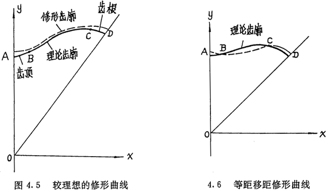 給參數(shù)Tz一負值增量(-△Tz),同時給參數(shù)l一正值增量△l,計算表明修形曲線形狀如圖4.6中虛線所示。修形曲線實現(xiàn)了在齒頂,齒根修形量較大的目標(biāo)(圖4.6中的AB段及CD段),但要想在保持頂根修形量較大的前提下,在齒廓中段獲得較長的工作區(qū)BC段,無論如何調(diào)整參數(shù)增量-△Tz及△l,都很難達到較理想的效果。對于其它組合修形,也有同樣的問題。為此,需要研究一種更理想的修形方法。