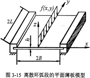 彈性力學(xué)是固體力學(xué)的一個(gè)分枝,主要研究物體(彈性體)由于受外力作用或溫度改變以及支座沉陷等原因而產(chǎn)生的應(yīng)力、形變和位移,彈性力學(xué)對(duì)彈性體作較精確的分析。對(duì)于本文的離散均載環(huán)弧段,環(huán)弧段的厚度h<<它的長(zhǎng)度2L(或?qū)挾?B),且撓度較小,可以利用彈性力學(xué)中薄板的小撓度變曲理論,將均載環(huán)結(jié)構(gòu)參數(shù)與剛度聯(lián)系起來(lái),通過(guò)正確處理邊界條件來(lái)改善計(jì)算結(jié)果。離散環(huán)弧段的計(jì)算模型如圖3-15所示,假定環(huán)弧段的支承邊界條件為兩端固支。