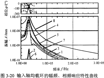 取輸入軸均載環(huán)的八個(gè)內(nèi)凸臺(tái)的中間點(diǎn)作為振動(dòng)響應(yīng)點(diǎn),示意圖同圖3-18所示。取輸入軸均載環(huán)系統(tǒng)粘性阻尼系數(shù)c=0.03,均載環(huán)的邊界條件取為均載環(huán)的八個(gè)外凸臺(tái)固支,輸出軸均載環(huán)和輸入軸均載環(huán)的有限元模型參數(shù)同3.5.3中研究的一致。于是應(yīng)用I-DEAS分析軟件Model Solution模塊中的Model Response部分,可以求得輸入軸均載環(huán)的暫態(tài)激勵(lì)幅頻、相頻響應(yīng)特性曲線如圖3-20所示。