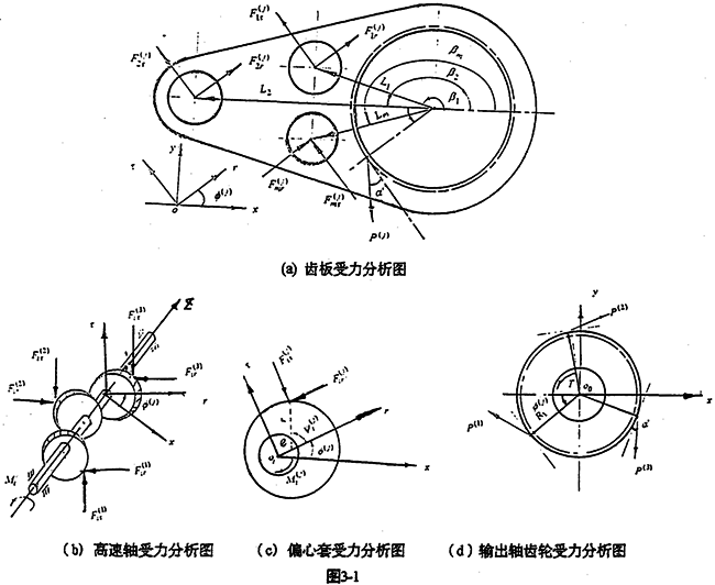 由于多相并列內(nèi)齒行星傳動(dòng)的N片行星齒板結(jié)構(gòu)相同,相鄰兩片之間的相位差為2Ω/N。因此,在一個(gè)周期范圍內(nèi),各片齒板的受力情況完全一樣,故只需分析其中一片齒板即可。齒板及高速軸、輸出軸的受力分析如圖3-1所示。用動(dòng)態(tài)靜力平衡法寫出機(jī)構(gòu)的動(dòng)力分析基本方程為