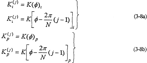 設(shè)偏心套與齒板之間的接觸變形剛度系數(shù)為K(j)i,內(nèi)嚙合齒對(duì)的變形剛度系數(shù)為K(j)P,它們除與構(gòu)件材料和幾何結(jié)構(gòu)有關(guān)外,還是機(jī)構(gòu)工況位置角φ(j)的周期函數(shù)。各相剛度系數(shù)之間的關(guān)系為