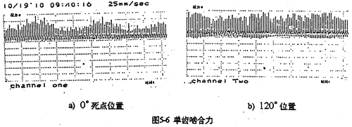 理想情況下,嚙合力的極小值在φ=0°、180°產(chǎn)生,極大值在φ=90°、270°產(chǎn)生,造成位置偏離的影響因素主要有軸承剛度,齒板剛度,嚙合角以及輸入轉(zhuǎn)速、傳動比等等。其中軸承剛度的影響極大。在死點的嚙合力也產(chǎn)不并一定為零。哈合力可能為負值。為負值時,將阻礙傳動的正常轉(zhuǎn)動,產(chǎn)生內(nèi)齒輪副的干涉現(xiàn)象。并引起減速器沖擊振動。因此,按照嚙合力過死點時為零的假設(shè)分布規(guī)律以及嚙合力為常數(shù)分布規(guī)律的模型分析,所得結(jié)果都是不可靠的。圖5-6是齒板死點位置180°及另一齒板位于超前120°嚙合點的單齒嚙合圖的測試結(jié)果。圖中每一棒線代表被測齒受嚙合力作用一次。比較兩圖可知,死點位置嚙合力總體水平低于120°位置時的嚙合力總體水平,與理論分析計算的結(jié)果完全吻合。