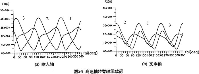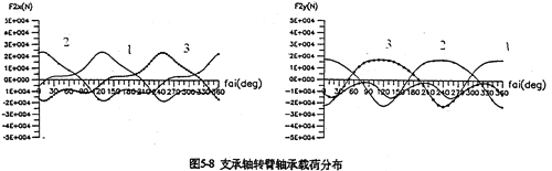 4.輸出軸的行星軸承總體載荷比支承軸行星軸承總體載荷大(圖5-9),特別是輸入軸X方向受力最大。輸入軸行星軸承載荷在死點附近取得最小值,在φ=105°、255°取得極大值。極大值產(chǎn)生的位置正好是機構(gòu)傳動角最佳位置附近。在同一時刻,齒板上各輸入軸行星軸承的受力狀況是不是一樣的。當某一齒板接近其死點位置時,軸承載荷較小,而同時另外兩片遠離死點位置的齒板上輸入軸行星軸承載荷要大得多。支承軸的軸承載荷在一個周期內(nèi)分別出現(xiàn)三次極大值和三次極小的值。由于這個原因使支承軸偏心套的微動磨損比輸入軸偏心套的微動磨損更為嚴重。行星軸承載荷的最大值為