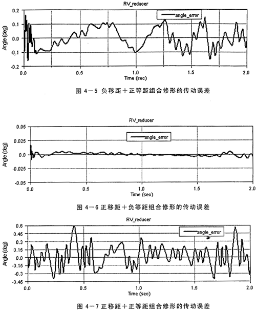 其中,θer——角度運動誤差,θin——任意時刻輸入軸轉(zhuǎn)角,i——傳動比,θout——輸出軸轉(zhuǎn)角。由于加工誤差、輪齒修形的原因引起瞬時傳動比的變化,必然出現(xiàn)傳動誤差,產(chǎn)生運動的不平穩(wěn)性。在RV減速器中,漸開線齒輪嚙合在前級,后級是擺線針輪傳動,由于后級的傳動比一般約是前級的4~30倍,前級的漸開線齒輪的傳動誤差將被縮小同樣的倍數(shù)后輸出,所以其傳動誤差關(guān)鍵取決于后級的擺線針輪的嚙合誤差,而實際工作中擺線輪的修形方式及修形量的選擇是影響擺線針輪的嚙合誤差很大的因素。因此本課題中僅研究了輪齒修形對傳動誤差的影響,所采用的修形量以及得到的傳動誤差大小如表4-1所示,限于篇幅,對于負移距+正等距、正移距+負等距和正移距+正等距組合修形的傳動誤差仿真結(jié)果曲線各只列出一組(圖4-5、4-6、4-7)。