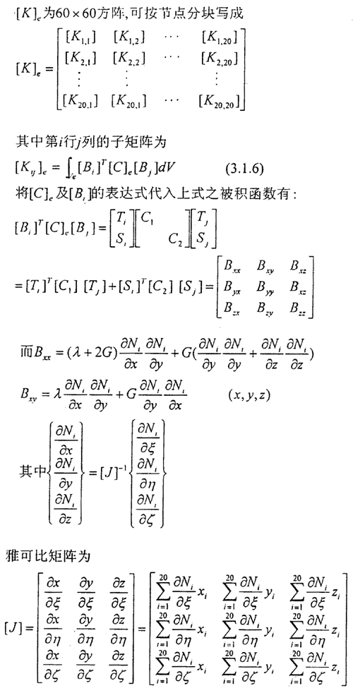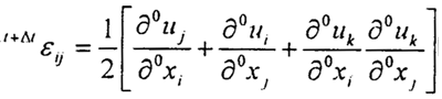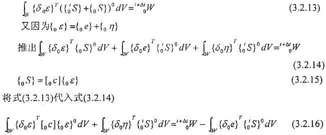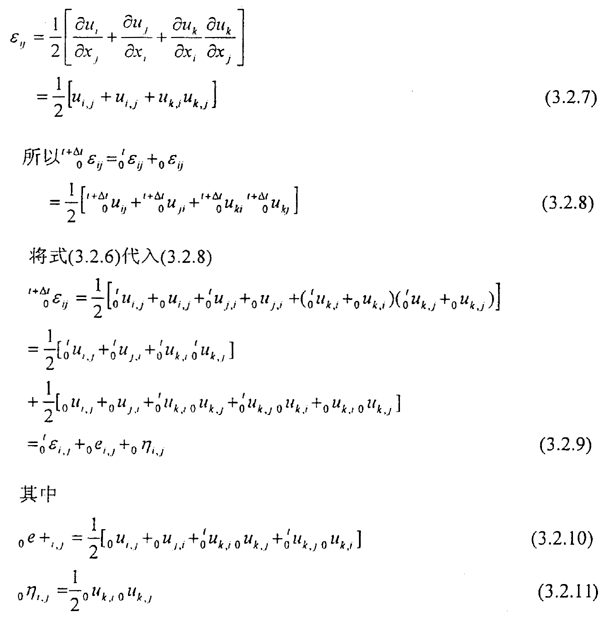 上式是將t+△t時刻的應(yīng)力、應(yīng)變、位移看成t時刻已知的應(yīng)力、應(yīng)變、位移和未知增量應(yīng)力{0S},應(yīng)變{0ε},位移{0u}之和,進(jìn)一步,增量應(yīng)變{0ε}可用線性部分即{oε}={oe}+{oη}