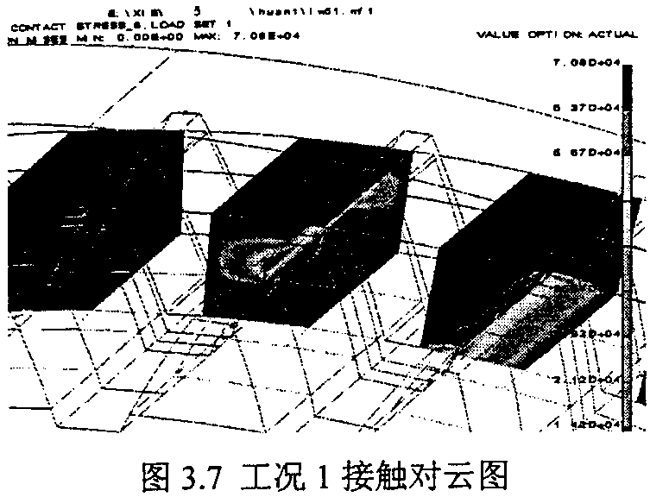 工況六至工況十這四和情況,是指兩環(huán)板之間不對稱,即偏心軸的兩個偏心拐的尺寸誤差不一致,這里考慮的是特殊狀況,從表3.10-3.13看出,當兩環(huán)板不對稱時,將產(chǎn)生嚴重的載荷不均現(xiàn)象,載荷偏向中心距小的環(huán)板內齒上,甚至只有一個環(huán)板承受載荷。由此說明,對于雙環(huán)減速器偏心軸有加工,應特別注意兩曲捌的制造誤差,應盡量使安裝好的兩環(huán)板具有較好的對稱性。圖3.7~圖3.12為六種工況下環(huán)板內齒的接觸齒對的應力云圖。