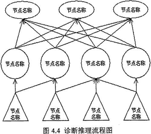 專家知識(shí)輸入引擎模塊內(nèi)容如圖4.3所示,該模塊的核心是用圖形化的方式建立診斷推理流程圖,該流程圖是由分布三個(gè)層次上的多個(gè)節(jié)點(diǎn)及節(jié)點(diǎn)間的連線所組成,如圖4.4。診斷推理流程圖中,底層為“數(shù)據(jù)”層,這里的數(shù)據(jù),可以是測(cè)量參數(shù)、傳感器的輸出、工作狀態(tài)、檢修記錄等多種廣泛意義上的參數(shù),中間層為“故障現(xiàn)象”層,這里的癥狀現(xiàn)象可以是能直接觀察到的現(xiàn)象(如工作條件、參數(shù)范圍、參數(shù)變化等),也可以是間接的現(xiàn)象,即多種廣泛意義上的現(xiàn)象。最上層為“故障原因”層。用連線相連彼此相關(guān)的“數(shù)據(jù)”與“故障現(xiàn)象”或“故障現(xiàn)象”與“故障原因”。這樣構(gòu)成診斷推理流程圖。