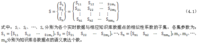 專家系統(tǒng)推理主要是從知識庫所需的數(shù)據(jù)集合D={D1、D2、…、Dn}出發(fā),根據(jù)知識庫中每一數(shù)據(jù)點相應的一個或多個語義表達和數(shù)據(jù)范圍,將獲取實時數(shù)據(jù)與知識庫中相應數(shù)據(jù)的語義表達和數(shù)據(jù)范圍進行相似性分析,得出相似性系數(shù)的集合: