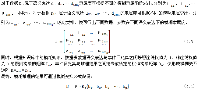 第三層為推理結(jié)果層。每個事件輸出Ei與推理結(jié)果Fj之間都有連線并賦有權(quán)值,參照模糊推理,推理結(jié)果為: