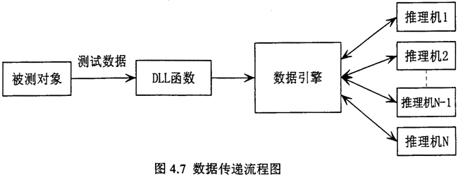 根據(jù)流程圖可知,從故障測試數(shù)據(jù)到數(shù)據(jù)引擎,有兩種數(shù)據(jù)處理方式,一種是故障測試數(shù)據(jù)由數(shù)據(jù)采集系統(tǒng)采集后,可先進行預處理,將故障信號數(shù)據(jù)處理為推理機所需的故障特征數(shù)據(jù),然后發(fā)送出去,動態(tài)連接庫DLL函數(shù)則通過網(wǎng)絡(luò)接收這些故障特征數(shù)據(jù),同時對照推理機向數(shù)據(jù)引擎申請的故障特征變量,將申請的故障特征變量對應的值找出,按數(shù)據(jù)引擎規(guī)定的格式反送給申請數(shù)據(jù)的推理機。另一種是故障測試數(shù)據(jù)由數(shù)據(jù)采集系統(tǒng)采集后,按一定格式直接發(fā)送出去,動態(tài)連接庫DLL函數(shù)則通過網(wǎng)絡(luò)接收這些故障信息數(shù)據(jù),然后再進行數(shù)據(jù)預處理,將故障信息數(shù)據(jù)處理為推理機所需的故障特征數(shù)據(jù),同時對照推理機向數(shù)據(jù)引擎申請的故障特征變量,將申請的故障特征變量對應的值找出,再按數(shù)據(jù)引擎規(guī)定的格式反送給申請數(shù)據(jù)的推理機。
