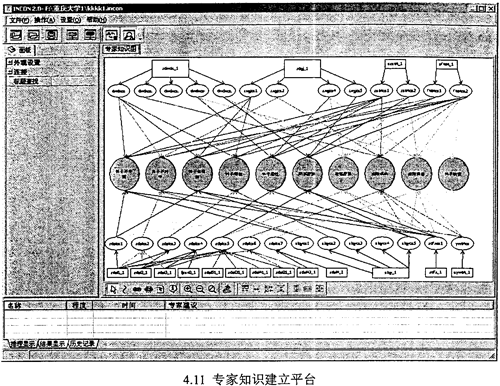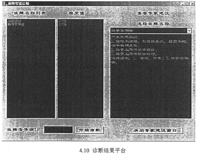 根據(jù)給出的數(shù)據(jù)端口及數(shù)據(jù)格式,即可按用戶的要求設(shè)計診斷結(jié)果輸出平臺。診斷結(jié)果應給出診斷故障的名稱、故障發(fā)生的部位,故障發(fā)生的時間及程度。對于不同的故障,提示故障發(fā)生的可能原因,給出相應的專家建議或維修方法等。圖4.10為本文集成系統(tǒng)的診斷結(jié)果輸出用戶界面。圖4.11為本文集成系統(tǒng)的專家知識庫建立及診斷推理平臺。