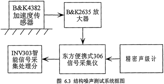 在測(cè)試產(chǎn)對(duì)所有的加速度傳感器,放大器及數(shù)據(jù)自動(dòng)采集處理系統(tǒng)進(jìn)行校準(zhǔn),對(duì)規(guī)定的所有測(cè)點(diǎn)進(jìn)行打磨,平磨并做好標(biāo)記,測(cè)試時(shí)在規(guī)定工況下依次將傳感器磁性底座放在各測(cè)點(diǎn)上。傳感器測(cè)得的振動(dòng)信號(hào)(包括速度級(jí)和加速度級(jí)振動(dòng)信號(hào))經(jīng)電荷放大器放大后進(jìn)入16通道卡式采集儀進(jìn)行采集記錄,用智能動(dòng)態(tài)信號(hào)分析儀分析各測(cè)點(diǎn)的1/3倍頻程度級(jí)結(jié)構(gòu)噪聲,再對(duì)所有的測(cè)點(diǎn)的結(jié)構(gòu)噪聲值做對(duì)數(shù)平均,得到總的結(jié)構(gòu)噪聲頻譜圖?諝庠肼曈寐暭(jí)計(jì)測(cè)量減速裝置各個(gè)測(cè)點(diǎn)的A計(jì)權(quán)聲壓級(jí)和1/1倍頻程聲壓級(jí)。各測(cè)點(diǎn)距齒輪箱測(cè)量表面的距離為1米。測(cè)試前已用標(biāo)準(zhǔn)噪聲源HY203-93260對(duì)聲級(jí)計(jì)進(jìn)行校準(zhǔn)。測(cè)試系統(tǒng)框圖如圖6.3所示。測(cè)試設(shè)備如下: