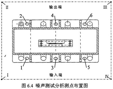 結(jié)構(gòu)振動(dòng)噪聲測(cè)試在齒輪箱安裝基腳布置6個(gè)測(cè)點(diǎn),測(cè)點(diǎn)布置圖見(jiàn)圖3中1-6測(cè)點(diǎn),在每一測(cè)點(diǎn)上按31.5Hz~5kHz1/3倍頻中心頻率測(cè)試加速度級(jí)頻譜(re:a0=10-6m/s)和1/3倍頻中心頻率測(cè)試速度級(jí)頻譜(re:a0=5*10-8m/s)?諝庠肼暅y(cè)試聲壓級(jí)基準(zhǔn)2*10-5Pa,用聲級(jí)計(jì)上的A計(jì)權(quán)聲壓級(jí)和1/1倍頻程聲壓級(jí)測(cè)量減速齒輪裝置各個(gè)測(cè)點(diǎn)。各測(cè)點(diǎn)距齒箱測(cè)量表面的距離為1米。測(cè)點(diǎn)位置見(jiàn)測(cè)點(diǎn)布置圖6.4中Ⅰ-Ⅳ測(cè)點(diǎn)。